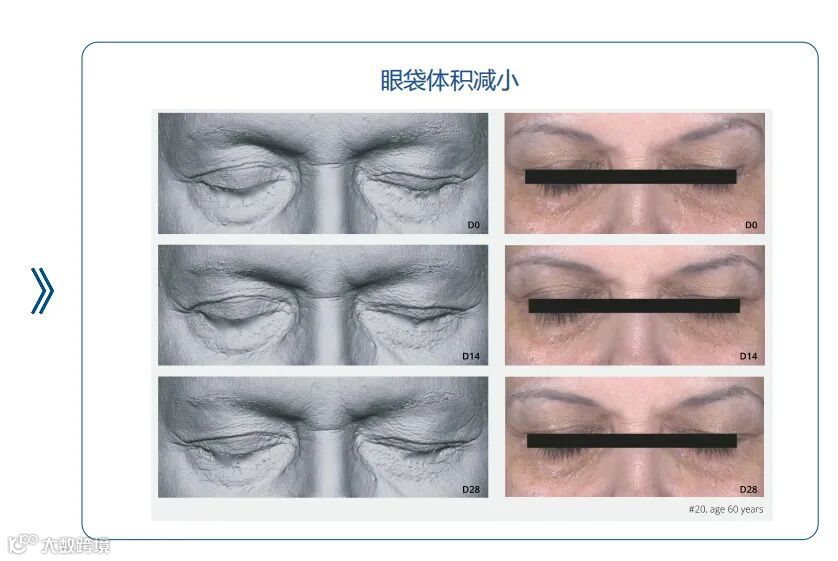 ▶ 结果:14 天和 28 天后眼袋体积迅速显著减少,减少眼袋体积达25%