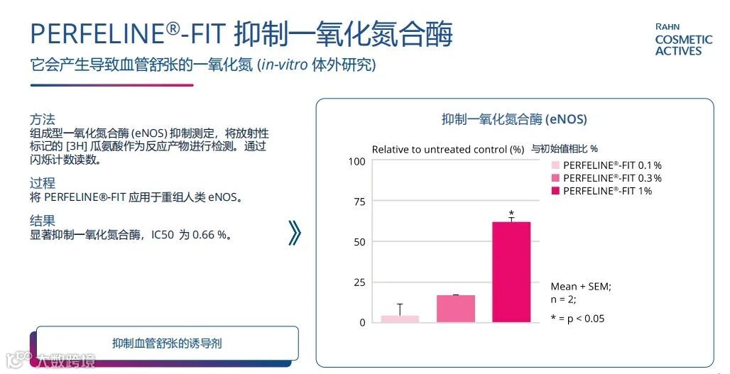 一氧化氮NO是促使血管舒张的关键诱导剂,In-vitro体外研究表明,我们发现PERFELINE® -FIT可显著抑制一氧化氮合酶,减少一氧化氮的生成,从而最终抑制因NO导致的水肿和血管瑕疵问题。