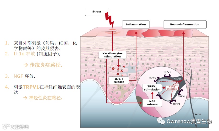 研究表明,皮肤通过两种主要途径与大脑沟通:①传统炎症路径: 细胞因子释放(白细胞介素等);②神经性炎症路径: 经由NGF释放导致TRPV1受体过度表达,只能由当事人自己察觉。