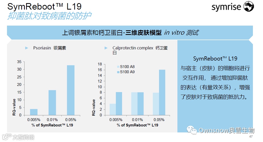 SymReboot® L19与宿主(皮肤)的细胞将进行交互作用,可促进两种抗菌肽的表达:钙卫蛋白(calprotectin)和银屑素(Psoriasin),增强肌肤应对细菌和真菌的侵袭。