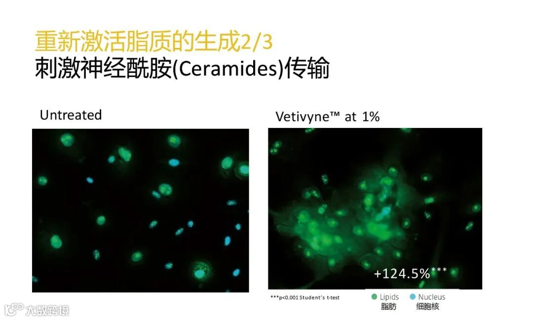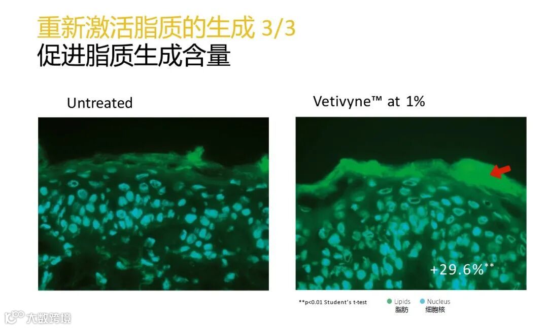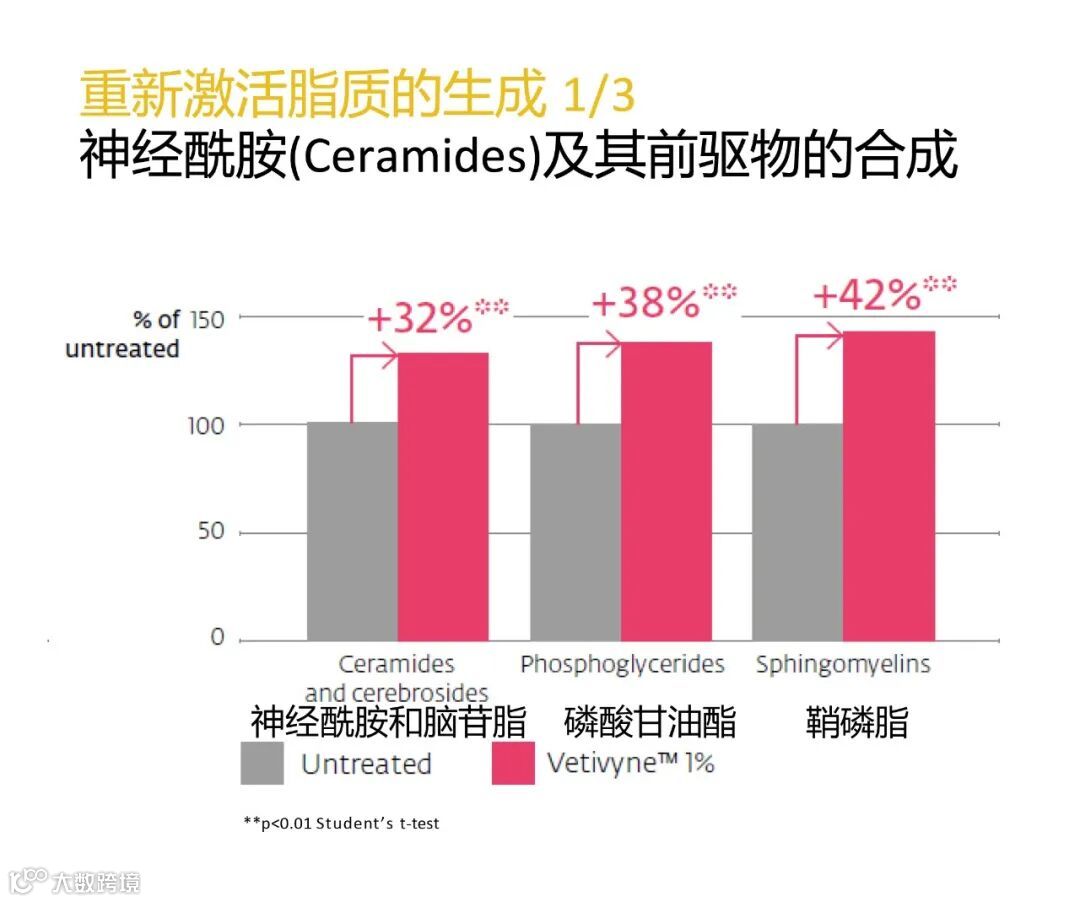 Vetivyne一方面可以增加神经酰胺的合成转运与快速形成层状屏障,另一方面对脂质的合成有明显的促进作用(增加皮脂细胞的皮脂累积+31%),是一款非常好的屏障修护&抗衰成分。