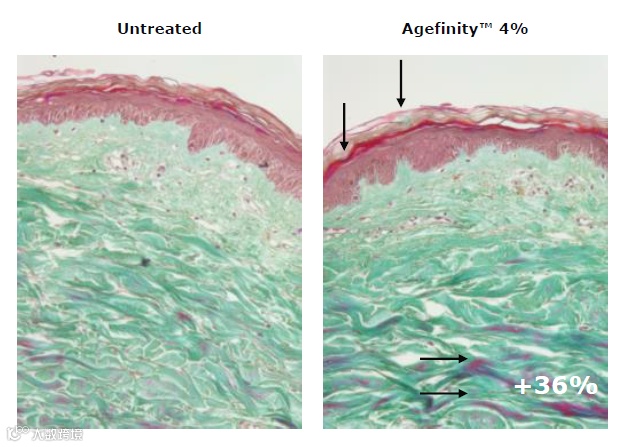 (ex vivo)离体测试:4%的Agefinity™明显增加真皮网状层的密度+36%,DEJ更完整,表皮粘附性更好。