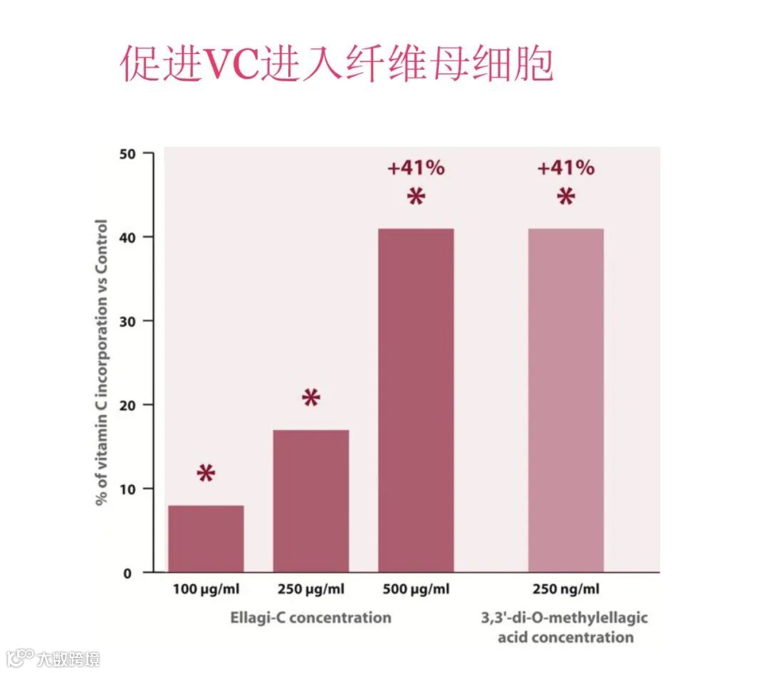 500μg/ml Ellagi-C可促进VC吸收提高41%。Ellagi-C的生物活性来自于含量丰富的3,3’-O-二甲基鞣花酸。