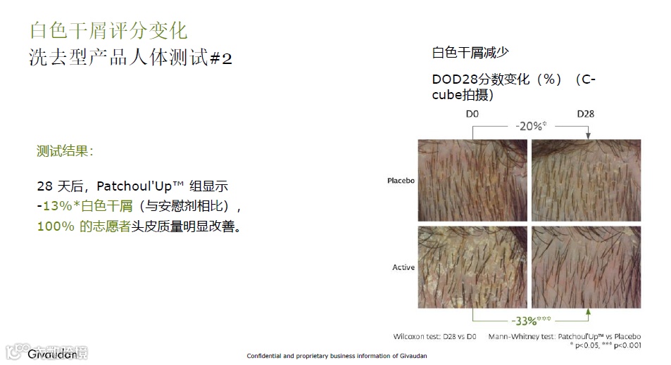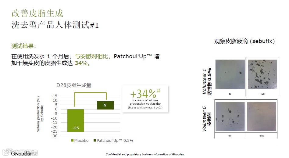▶ 使用1个月含Patchoul'Up洗发水,干燥头皮的皮脂生成+34%;28天后,与安慰剂相比,白色干屑-13%。
