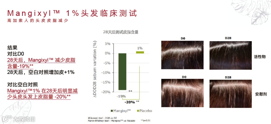 ▶ 对比空白组,1% Mangixyl在28天后明显减少头皮皮脂量-20%