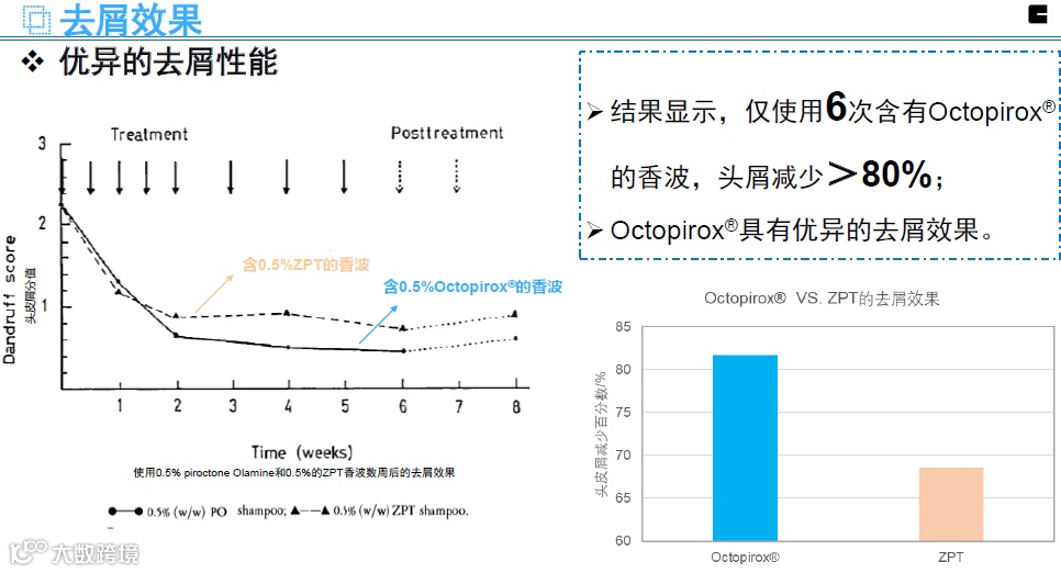 去屑天花板—OCT具有优异的去屑性能,还具有头皮&头发的抗氧化性能,控油,改善头皮屏障,增加头发数量的功能,并兼具防腐性能。