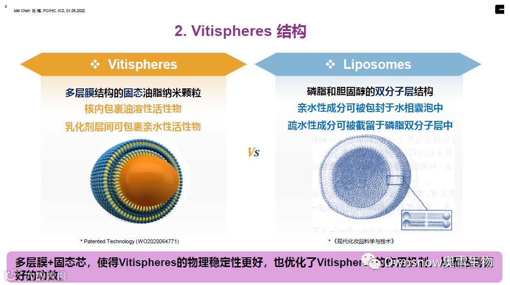 Vitispheres是一种稳定的、具有多层膜结构的固态油脂纳米颗粒(Solid Lipid Nanoparticle, SLN),是科莱恩独特的专利传输体系,用来传输护肤品配方中的活性物到皮肤上,从而达到特定的功效。