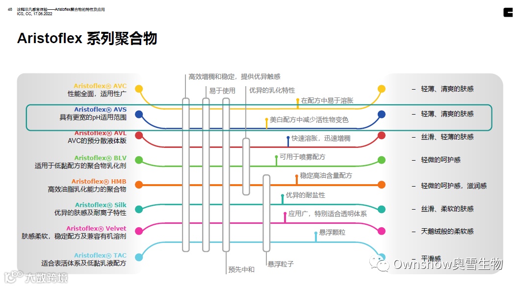ARISTOFLEX® 系列聚合物具有预中和、PH范围稳定、可在各工艺阶段添加等特点,其优势在于赋予个护产品优异的增稠效果和卓越的肤感体验。