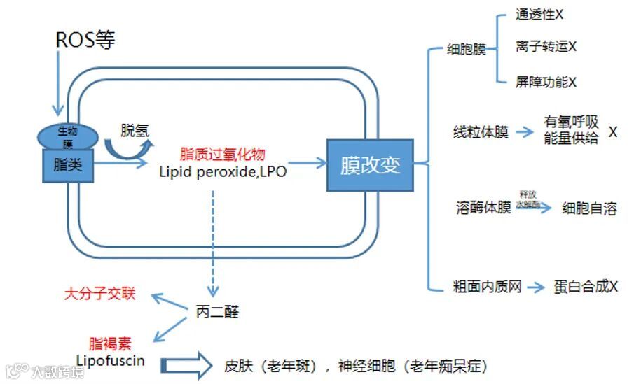当自由基造成脂质氧化时,细胞膜氧化受损,影响一系列细胞的功能,包括屏障功能、线粒体能量供给、细胞自噬力、蛋白合成的能力都会下降。