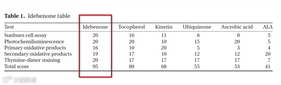 对艾地苯醌的抗氧化研究表明:综合五项评分结果,艾地苯醌的抗氧化能力远超维生素E、激动素、辅酶Q10、维生素C和α-硫辛酸(ALA)。