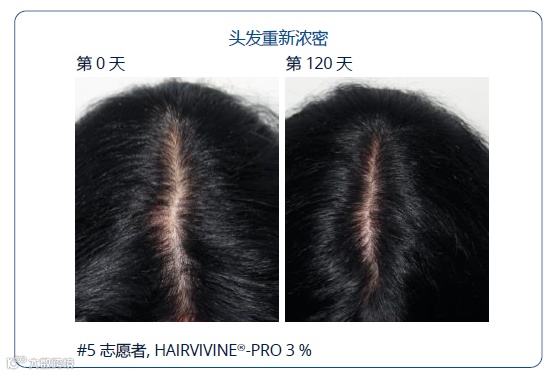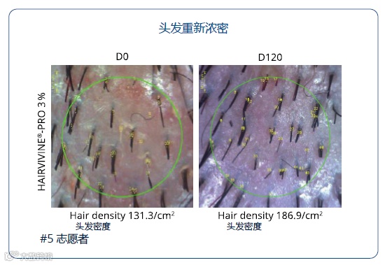 观察到志愿者的头发中分区,头发密度得到改善,新头发的生长很明显。120天后,大约生长出39,000根新头发。