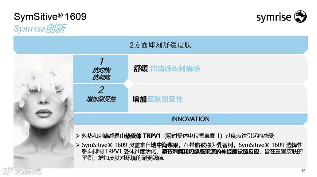 研究表明,灼烧感和刺痛感是热感受器-TRPV1 受体过度表达的结果。为开发出TRPV1拮抗剂,德之馨研发团队从22962活性物中筛选开发出SymSitive®1609 馨肤怡专利产品,化学结构—叔丁基环己醇,可以有效抑制TRPV-1受体被过度活化,从而降低刺痛感和灼烧感,增加皮肤耐受性,为“火辣皮肤”降温!