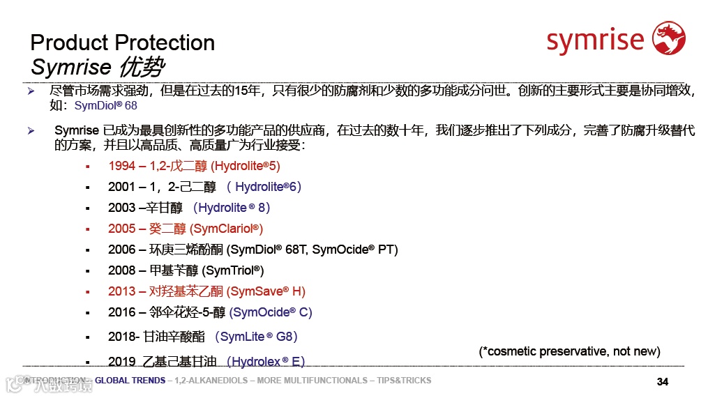 Symrise筛选并开发出一系列高效、温和、绿色天然的新型产品保护&防腐替代方案,满足未来消费市场对防腐剂替代的需求。