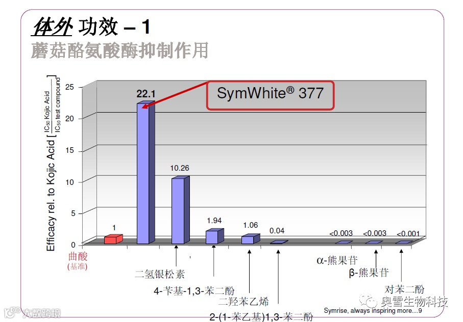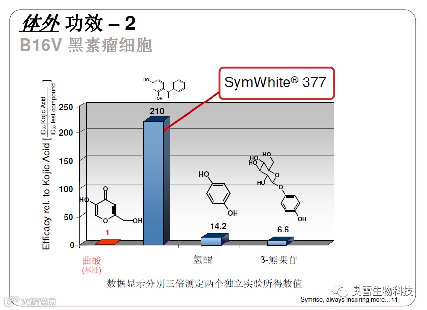 377具有优异的皮肤美白效果,酪氨酸酶抑制实验显示:377的抑制效果是曲酸的22倍;377能有效抑制B16V细胞合成黑色素的活性,其抑制效果是曲酸的210倍。