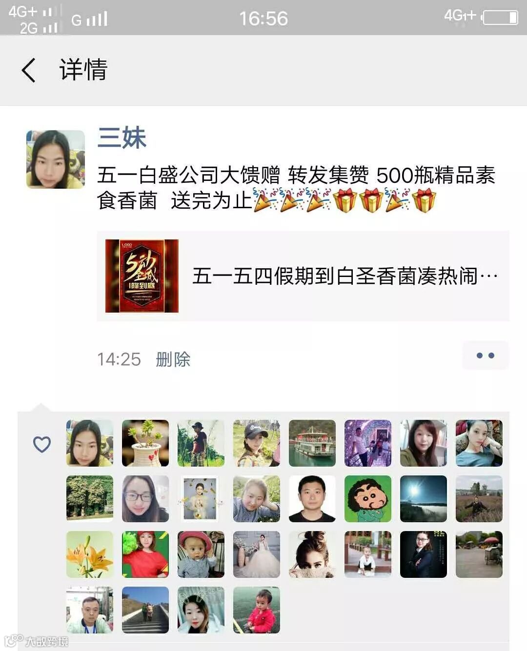 ,集赞28个就可以免费领取价值28元的精品素食香菌一瓶。并扫码关注惊喜多多!