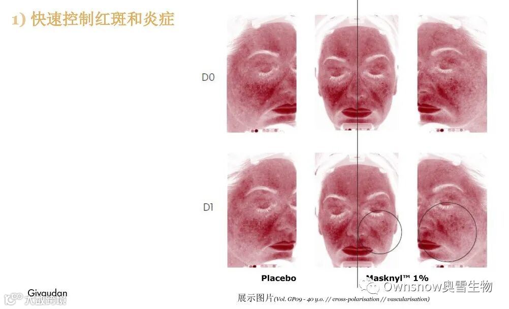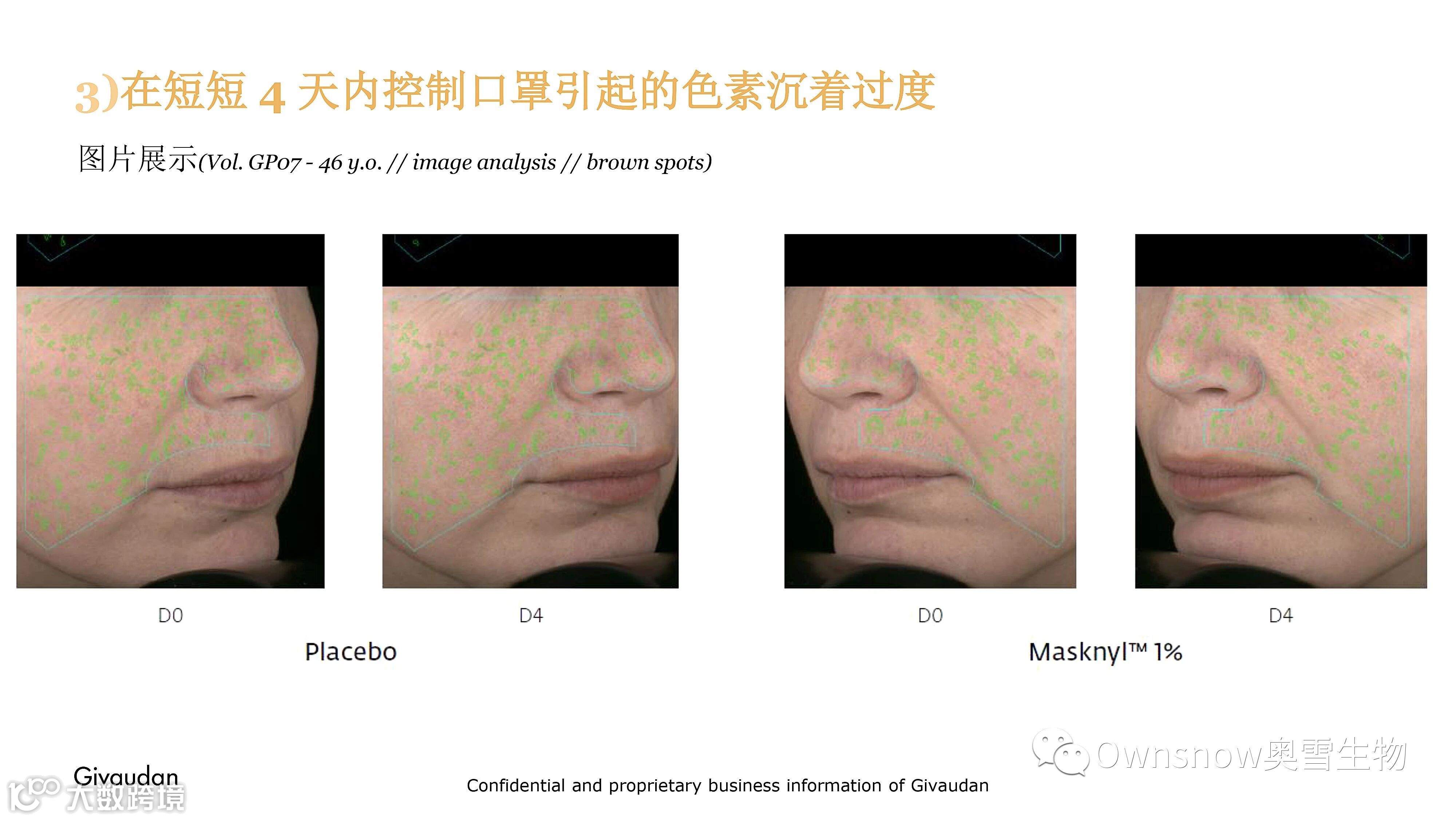 • 1% 的 Masknyl™ 可在短短 4 天内显著减少口罩区域的褐色斑点数量,与安慰剂相比减少3.5%(与 D0 相比 减少2.4%)。