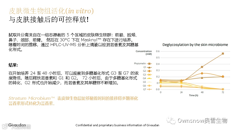 这种“糖基化”过程的产物就是MASKNYL™,一种纯净且明确的多糖基化芸香素的组合。葡萄糖部分的分布不仅有助于增加溶解度,而且有助于通过皮肤微生物群落的去糖基化获得活性芸香素的缓释。