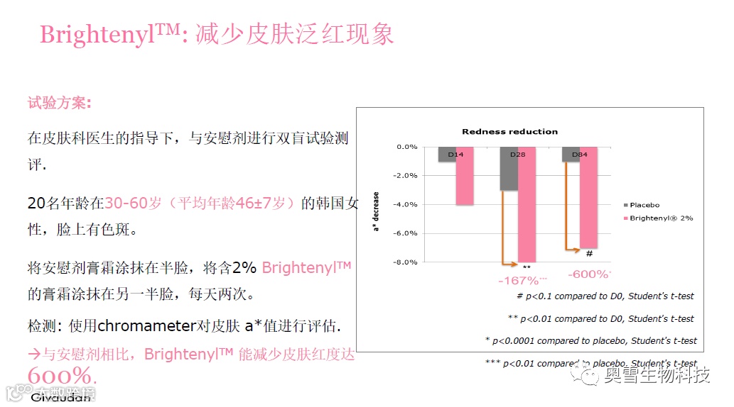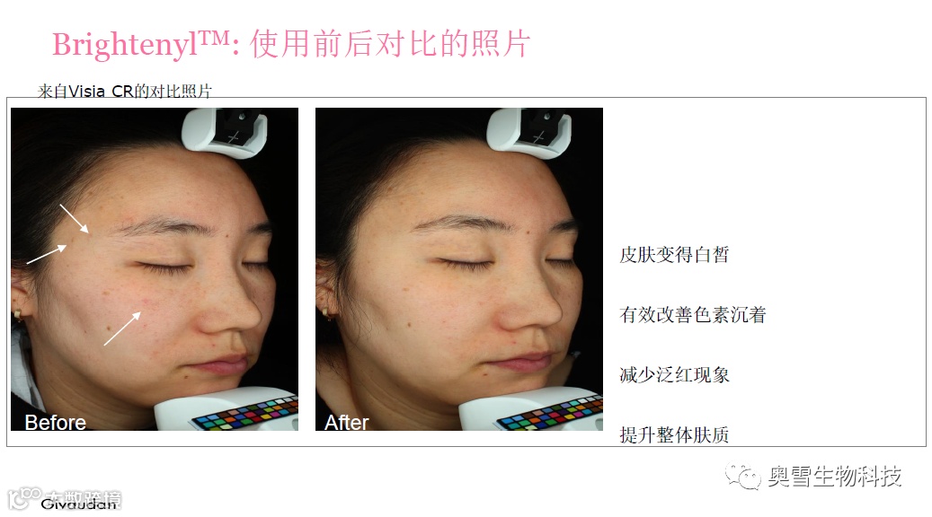 临床数据表明:Brightenyl®可减少晒斑和均匀肤色、提升皮肤明亮度、减少皮肤泛红现象、提升皮肤美白度。