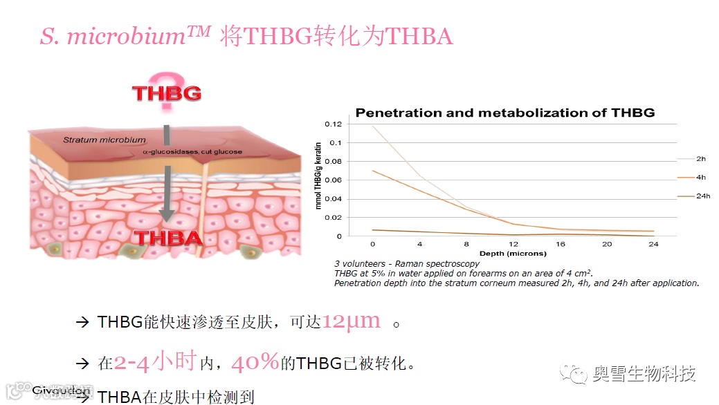 受此启发,研究人员给THBA添加了一个葡萄糖键,合成了一个分子叫做二葡糖基棓酸(THGB),经过皮肤微生物分解,THGB转化为THBA发挥作用。