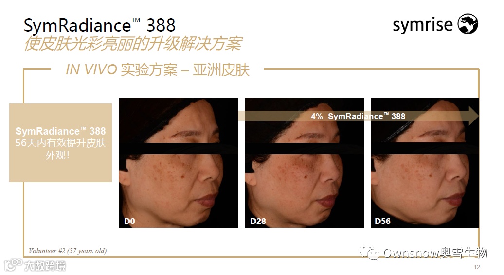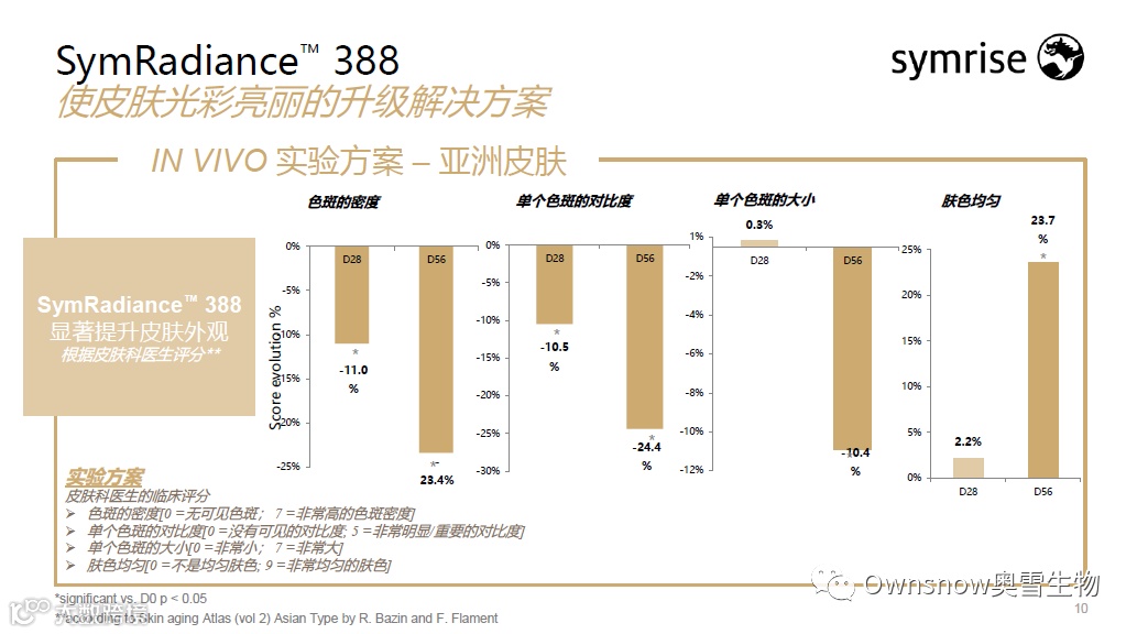 • 使用4% SymRadiance™, 56天后,色斑密度降低23.4%;单个色斑的对比度降低24.4%;单个色斑的大小减小10.4%;肤色均匀度提升23.7%。