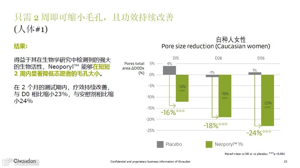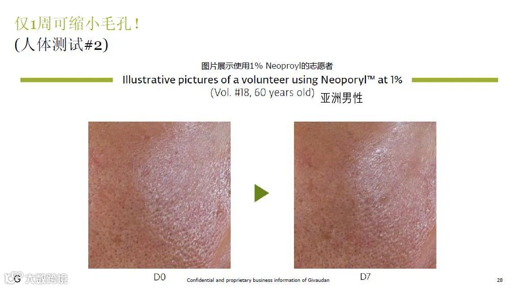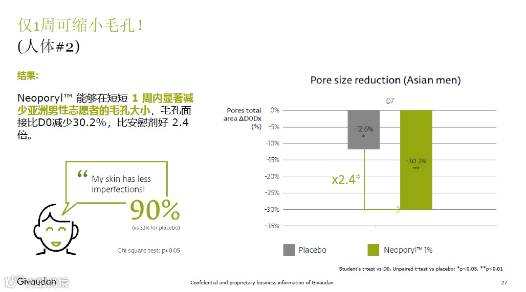 亚洲男性志愿者,短短1周内毛孔大小显著减小 30.2%,效果比安慰剂好 2.4 倍,皮肤外观也得到了明显的改善。