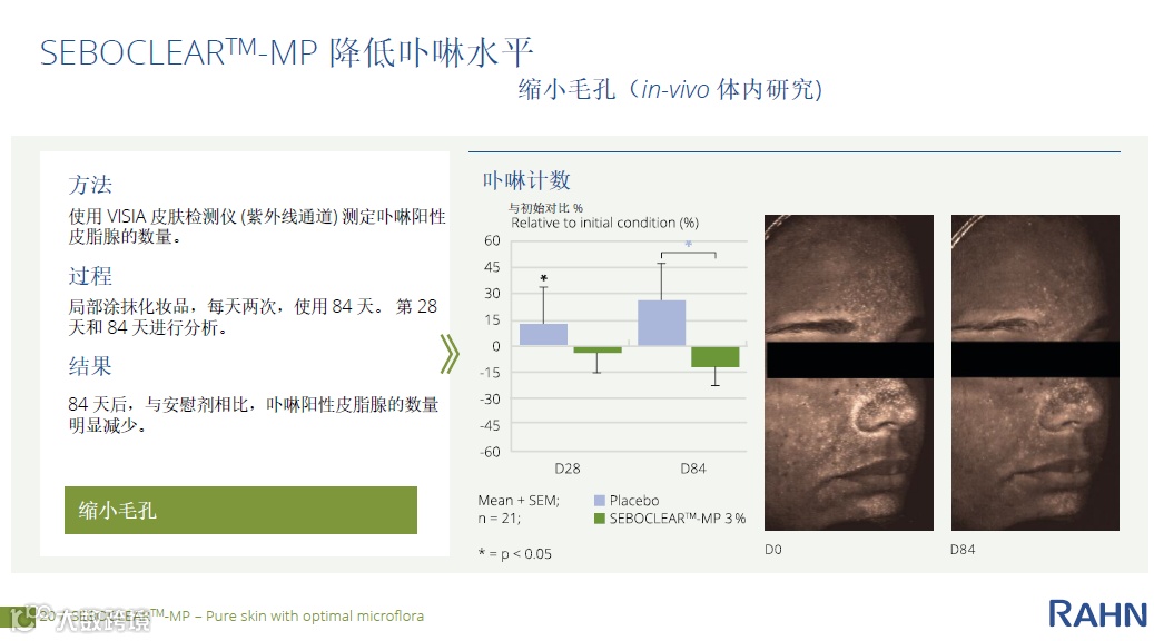 SEBOCLEAR™-MP可减少卟啉水平和毛孔可见性下降12%;减少38%的粉刺总数,减少36%的黑头,41%的白头(in-vivo 体内研究)。