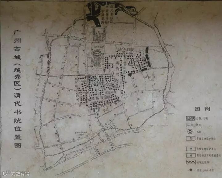 曾几何时,越秀古书院群的朗朗书声、幽幽书香蕴藏着南粤学子的入仕梦。但如今,经过时代的变迁和历史的洗礼,这里大多数主建筑已面目全非了。书院的房屋结构经过多次改建,变成了租金低廉的“房中房”,湮没在市井之中,演绎着现实版的“72家房客”。广州越秀区清代书院位置图。