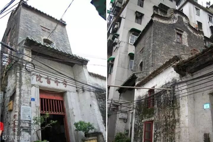 考亭书院,大门上的奎楼(书院门楼,又叫魁楼,寓意高中)作为广州现存最高大完整的书院奎楼仍气势不凡,但主建筑早在四十多年前就被改建成极不协调的三层楼房。庭院一半也盖起平房。