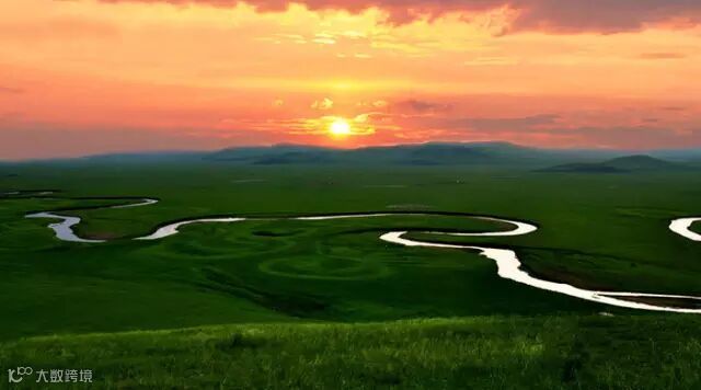 当太阳从草原上出现的时候,草原的天空呈现一层淡紫色。蜿蜒的河流静静沐浴着晨光。