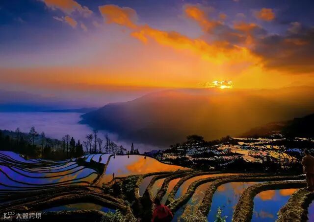 当阳光顺着梯田一层一层往上爬, 红霞满天,云雾滚滚,阳光投射到梯田,金波闪闪,十分壮美。