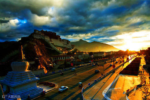 布达拉宫在清晨时也分外美丽。日出时分,白红相间的宫殿,瞬间金碧辉煌。
