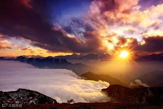 当太阳从山群之间升起的一刹那,像波涛般涌动的朝霞满天,只有山和树的剪影才知道天在哪里,地在哪里。