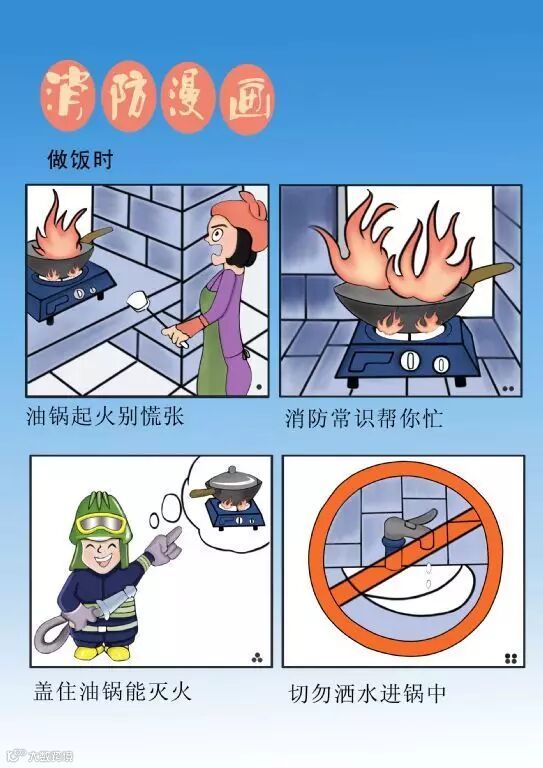 答:切断火源、盖上锅盖,稍后再揭开,或将青菜覆盖在油锅上,油火就可熄灭。
