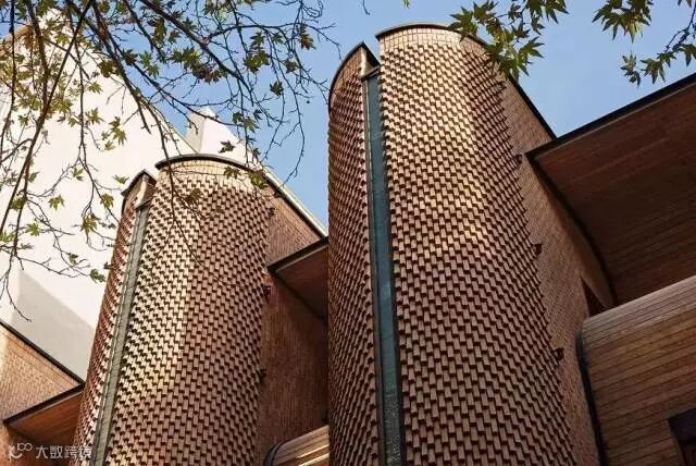 半圆形的柱形结构,通过加入竖形的玻璃窗户采光,表面的红砖利用错位的砌法,制造出粗糙而富有质感的墙面,与两边弧形的墙面形成了唯美的呼应。