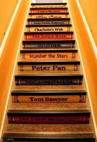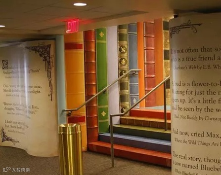 美国密苏里州圣路易斯儿童博物馆中的“神奇书屋”,有写着美国小孩必读书的书名的楼梯和用一页书的文字做成的入门墙壁。