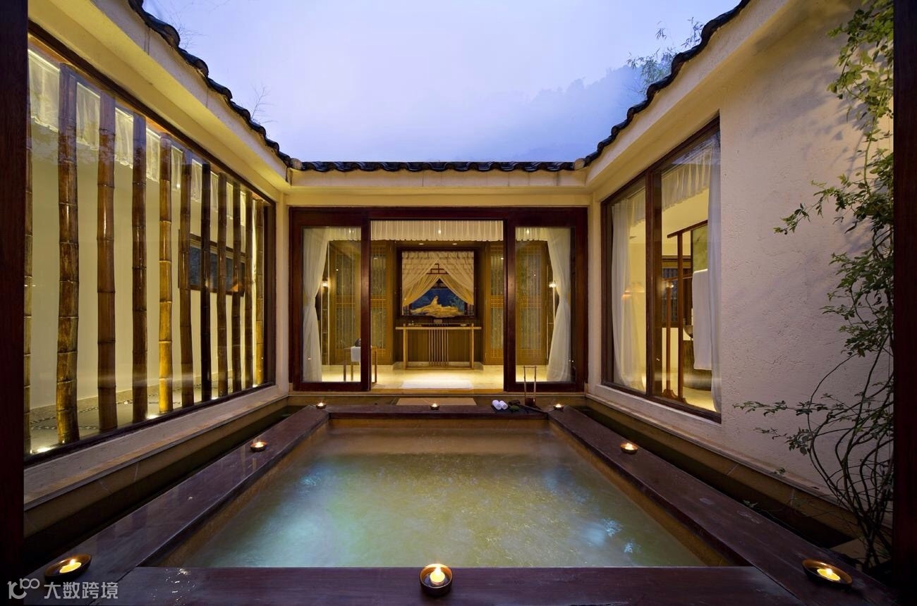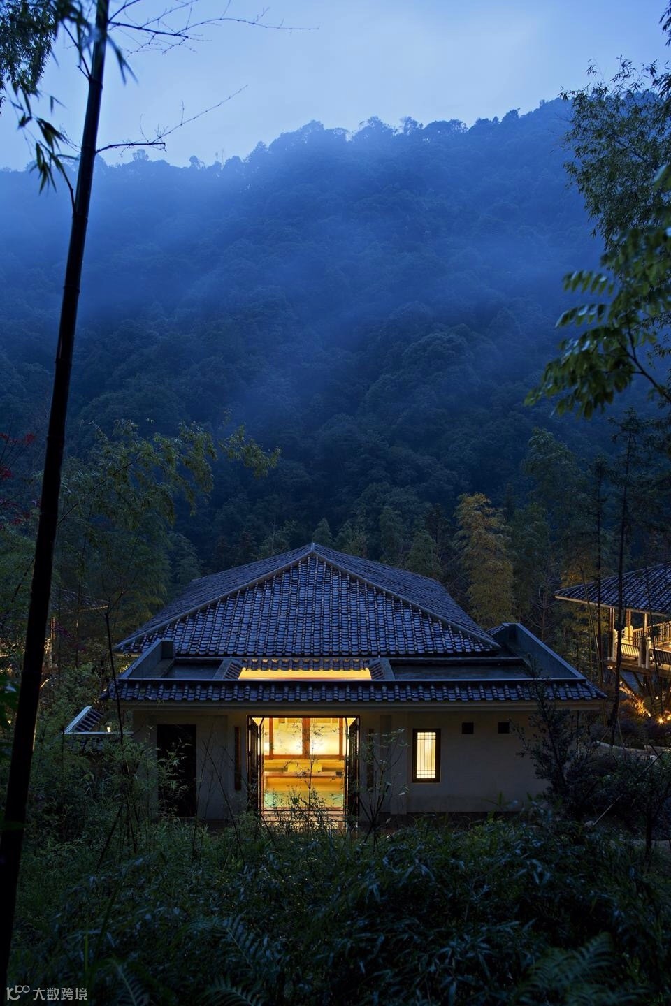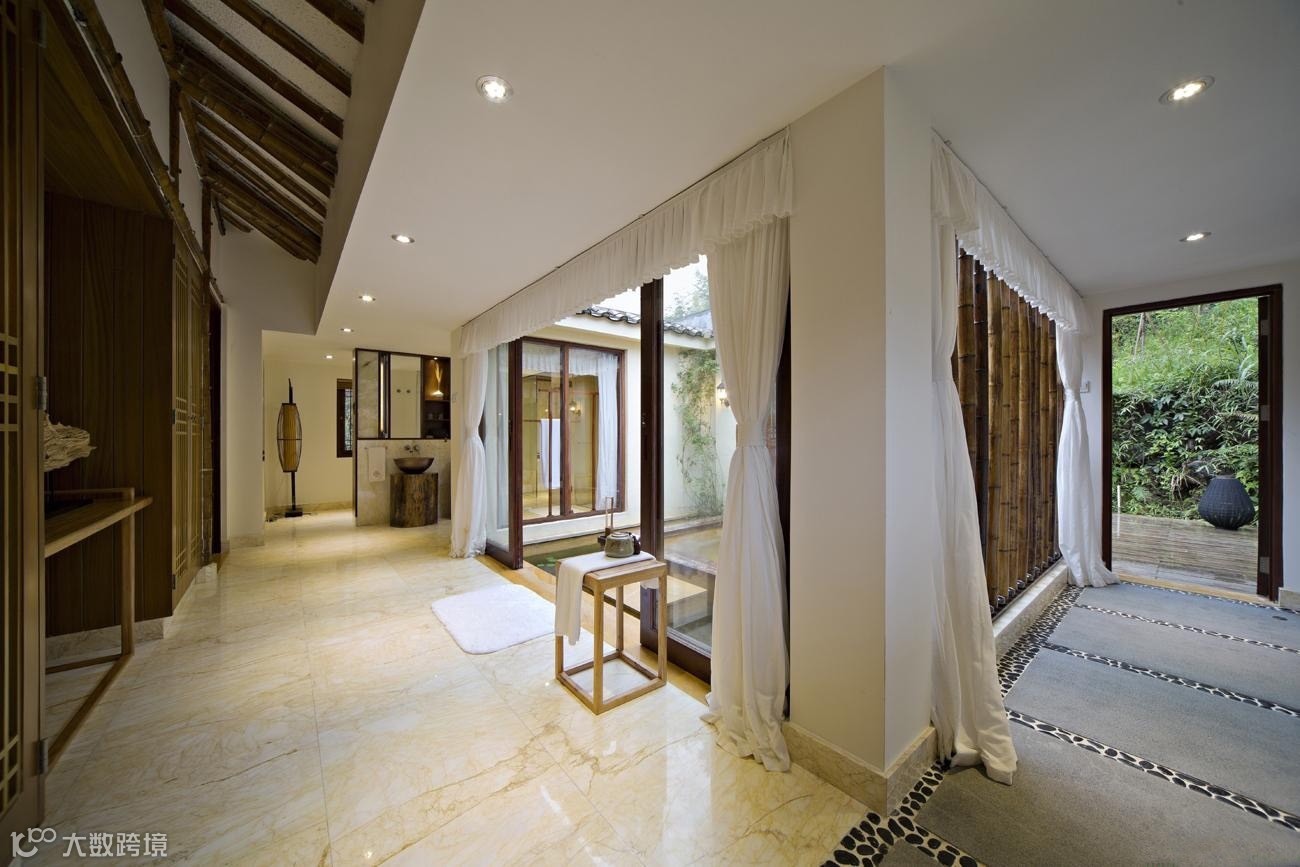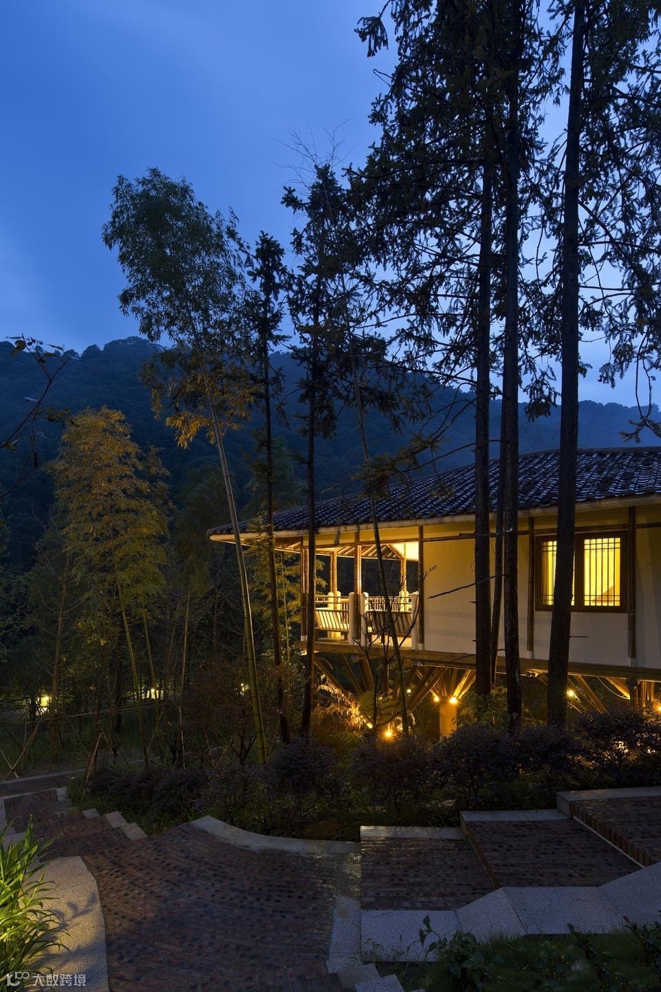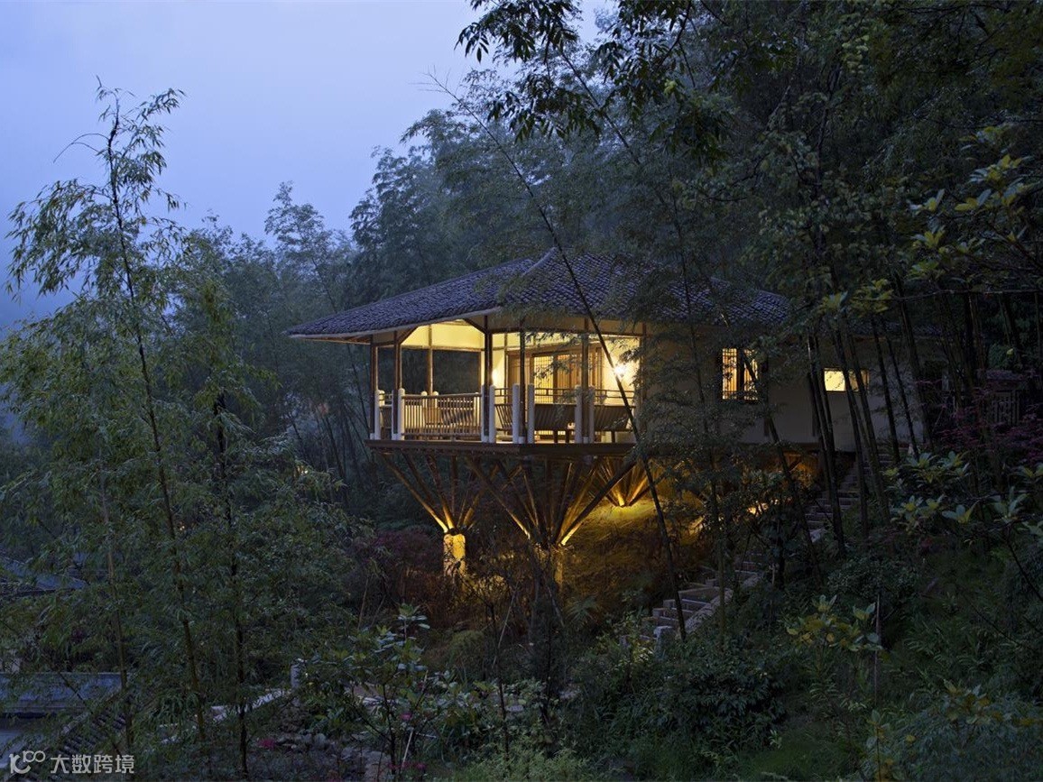 竹别墅室吸取客家民居建筑灵感,前半部吊脚楼与后半部天井院落相互结合。前半部为32根木桩托起的吊脚楼,包括客房和观景阳台,成为“干区”;后半部为天井式温泉区,包括温泉池和户外平台,称为“湿区”。如此,使得建筑的功能性和艺术性得到扩展,可谓“干湿结合”。