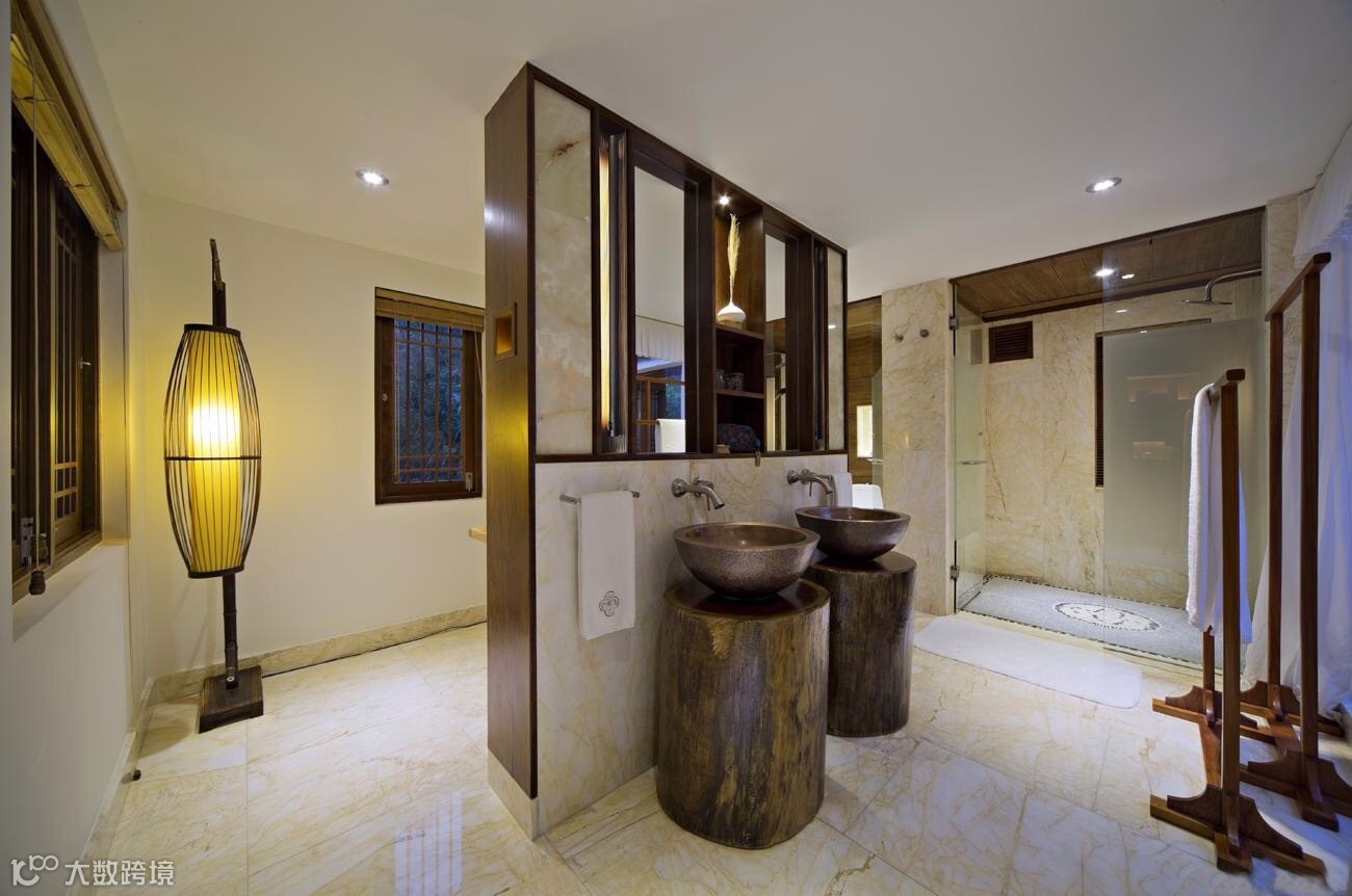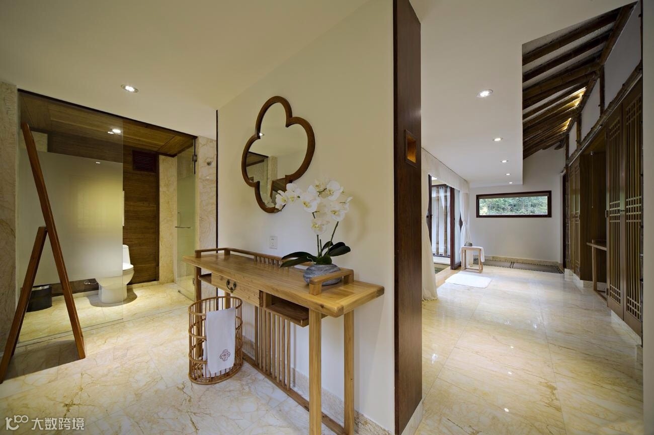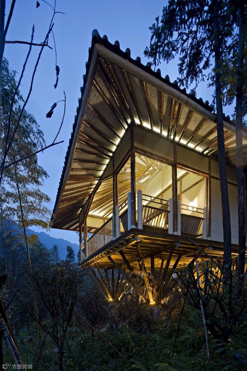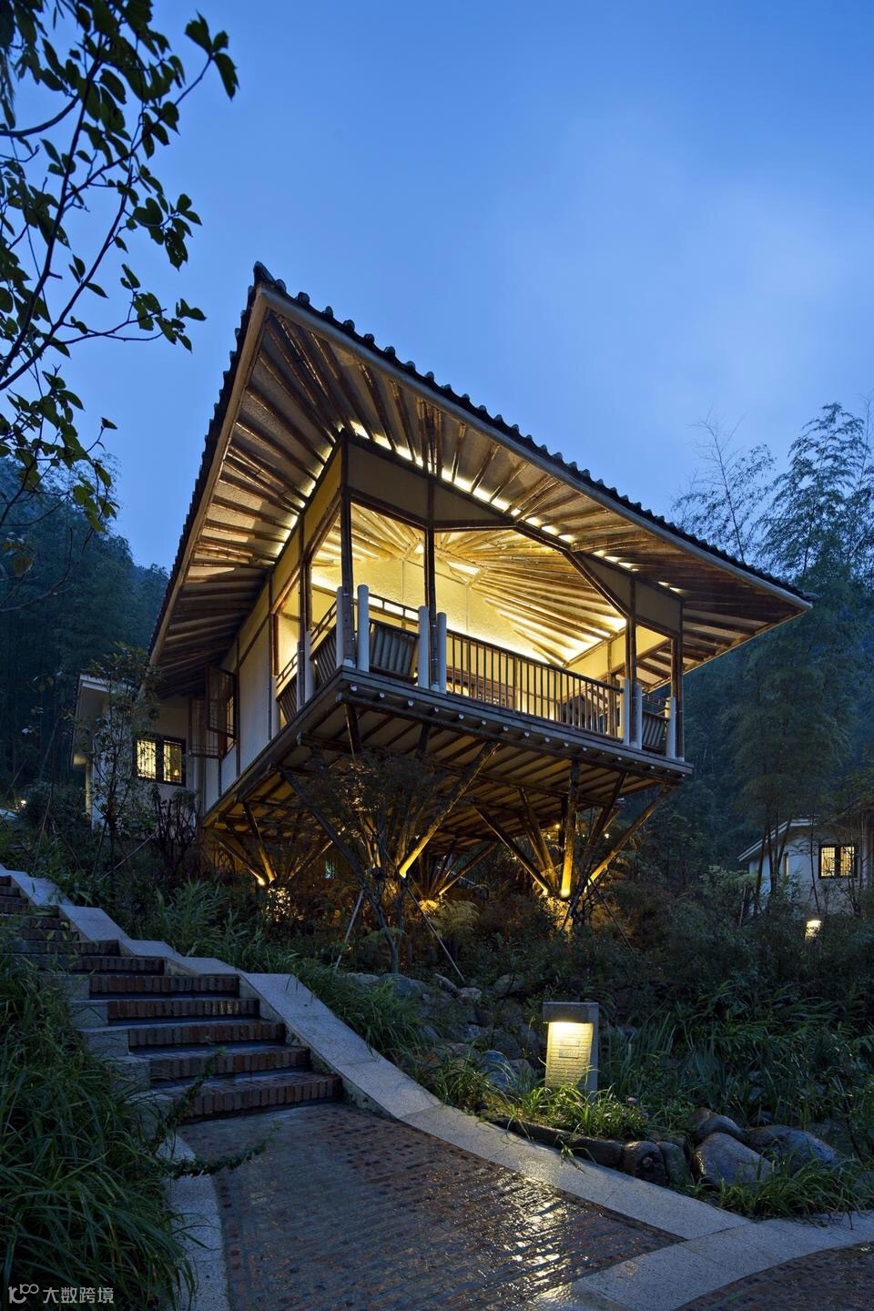 竹别墅室吸取客家民居建筑灵感,前半部吊脚楼与后半部天井院落相互结合。前半部为32根木桩托起的吊脚楼,包括客房和观景阳台,成为“干区”;后半部为天井式温泉区,包括温泉池和户外平台,称为“湿区”。如此,使得建筑的功能性和艺术性得到扩展,可谓“干湿结合”。