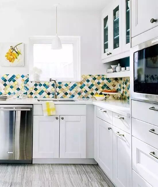 白色瓷砖的形状有很多,如果你选择的形状不对,不是把厨房装成了洗手间,就是装成了楼房的外立面,所以不要觉得白色瓷砖无聊,只是你没有选对瓷砖的形状和质感。当然,你可以选用摩纳哥风格的花瓷砖,让厨房的整体感觉更活泼。