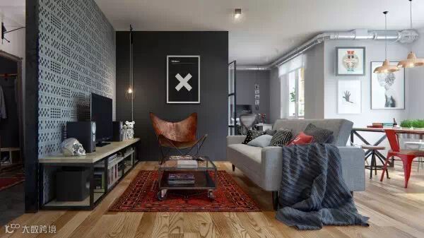 工业风格电视背景墙和温暖的皮革椅子带来一种刚强力量感。