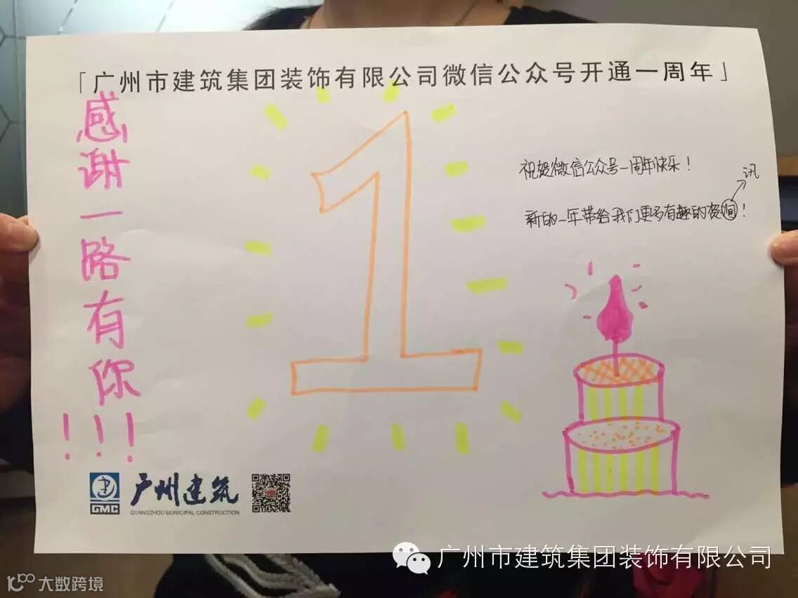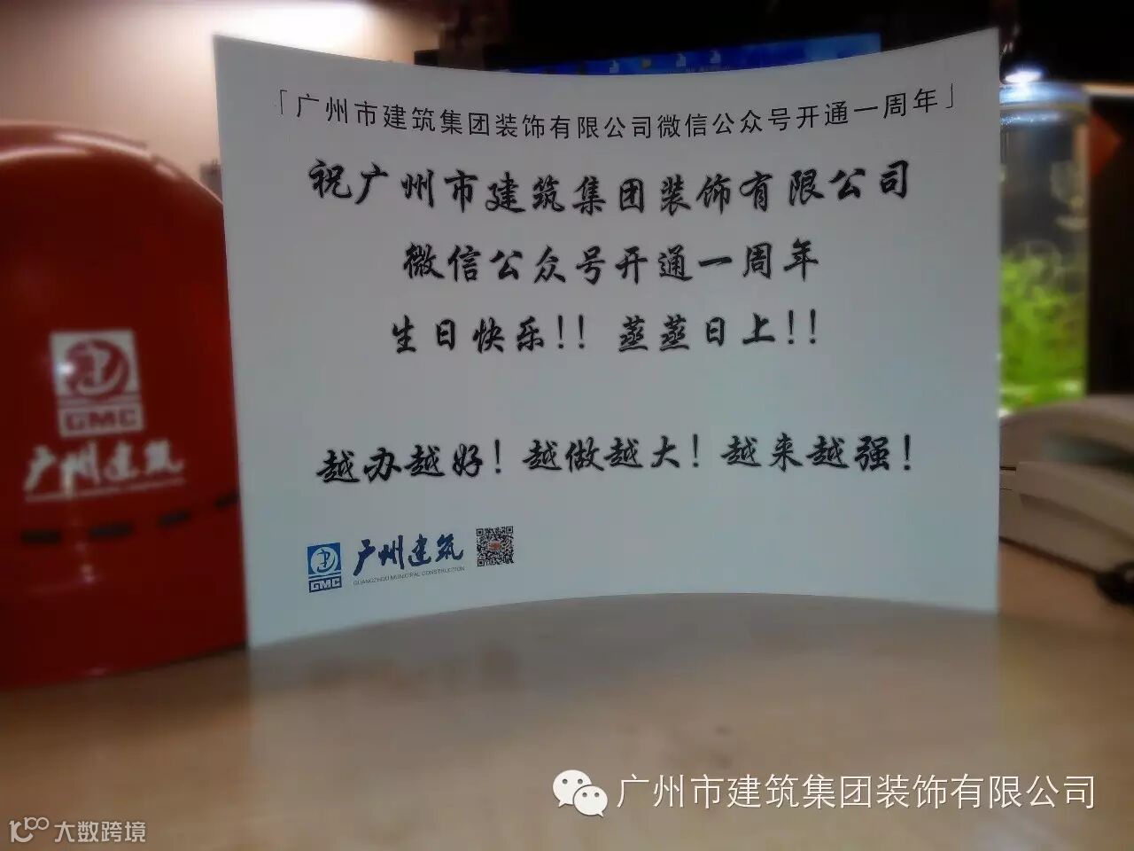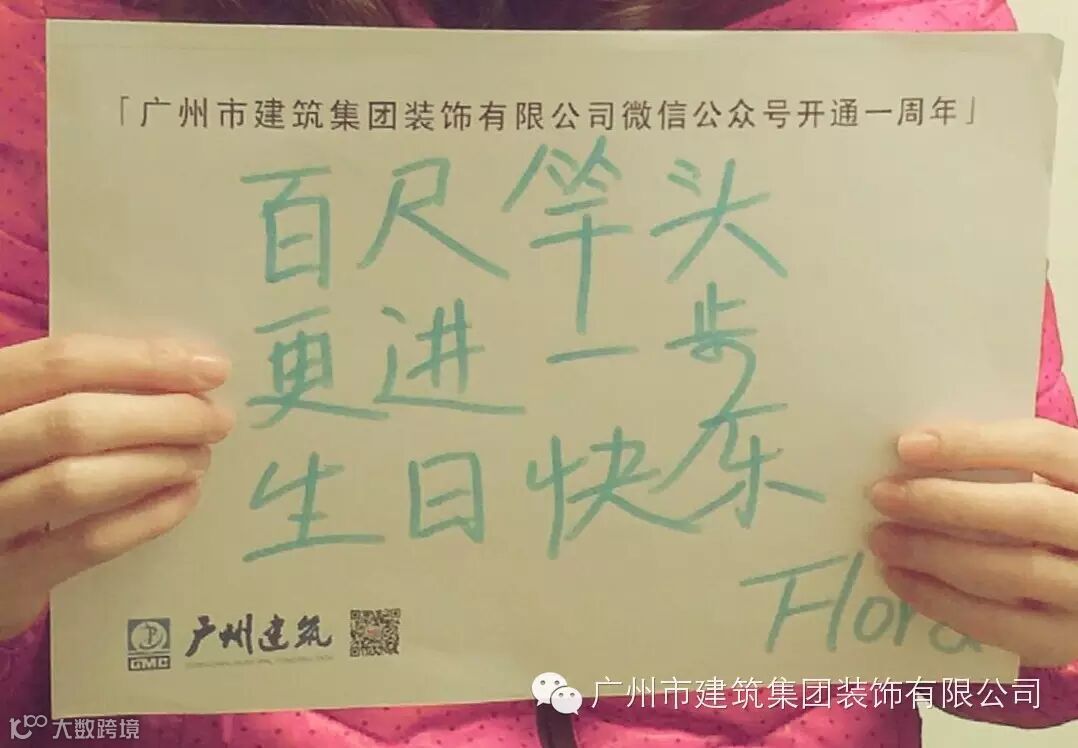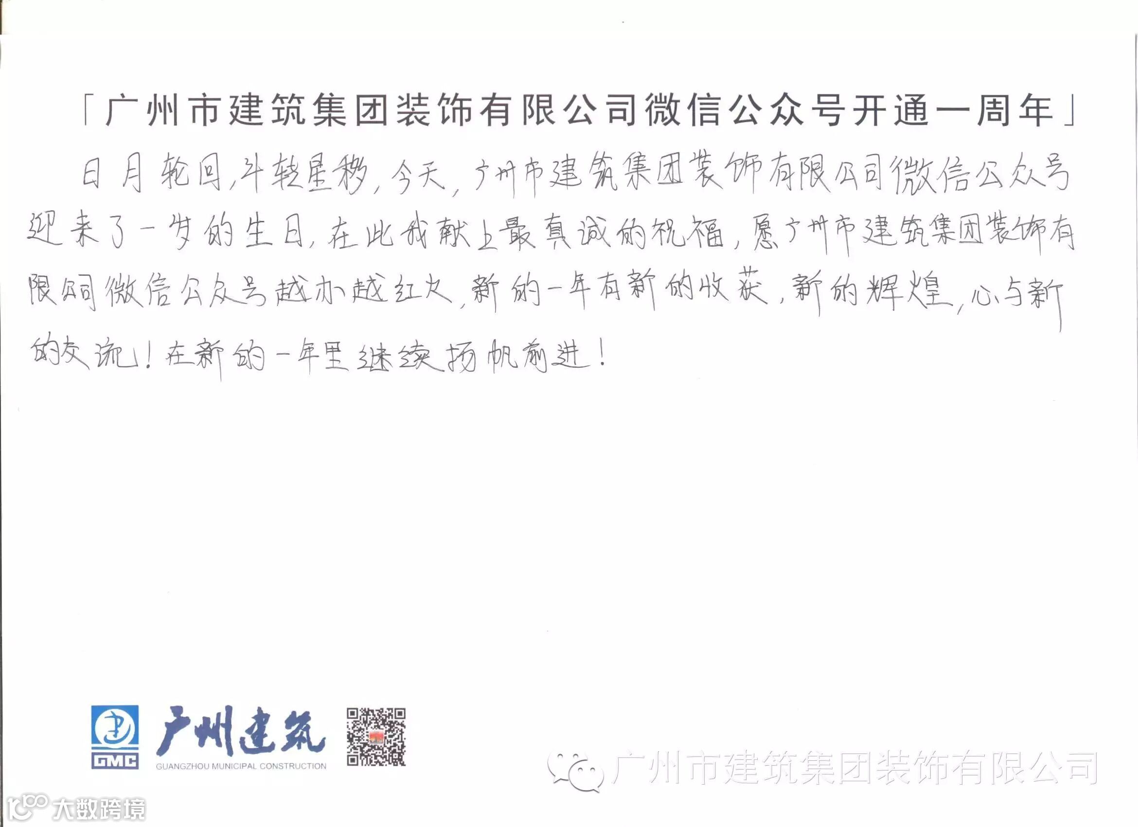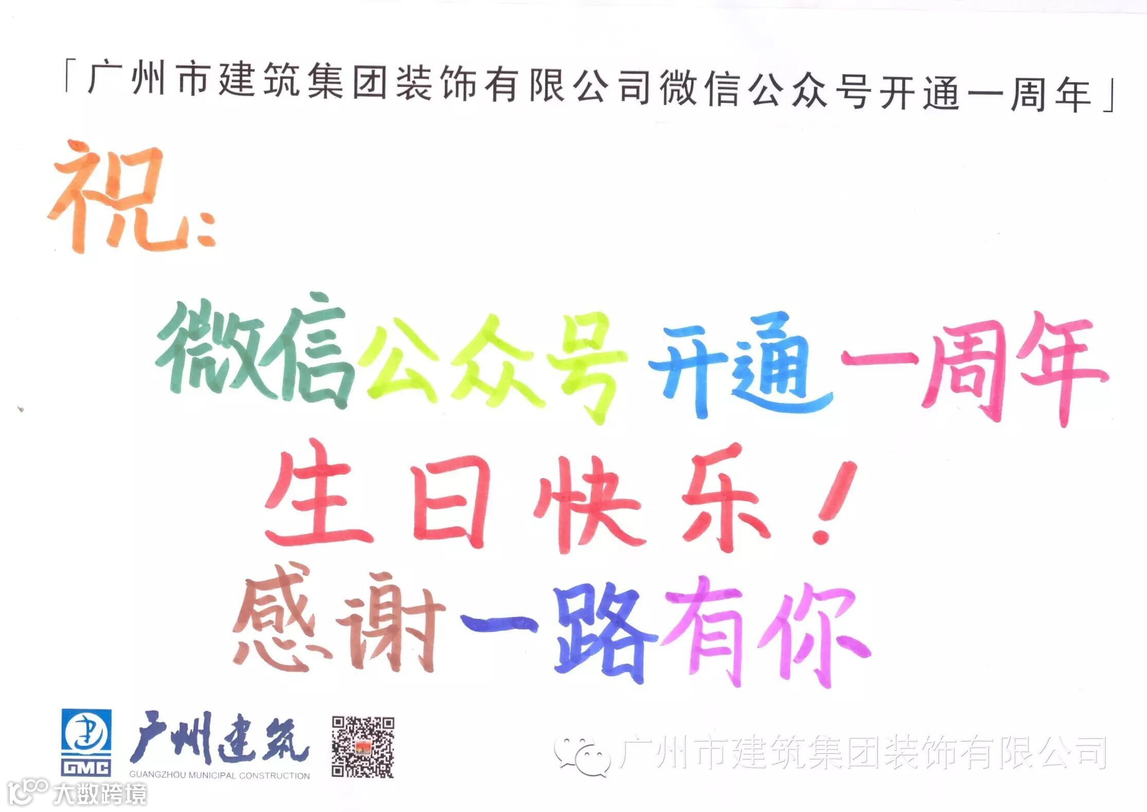 公司同事送祝福:“庆祝广州市建筑集团装饰有限公司微信公众号开通一周年!在过去的一年里,公众号发表的文章非常符合现代建筑装饰行业的发展状况及建议,具有很强的学习性,同时也辛苦为微信公众号为之付出的同事,在新的一年里祝微信公众号越办越好!”
