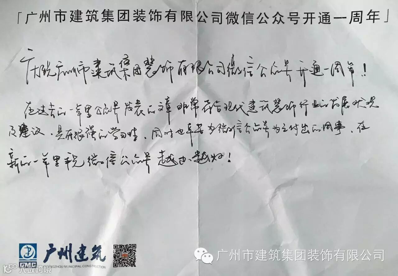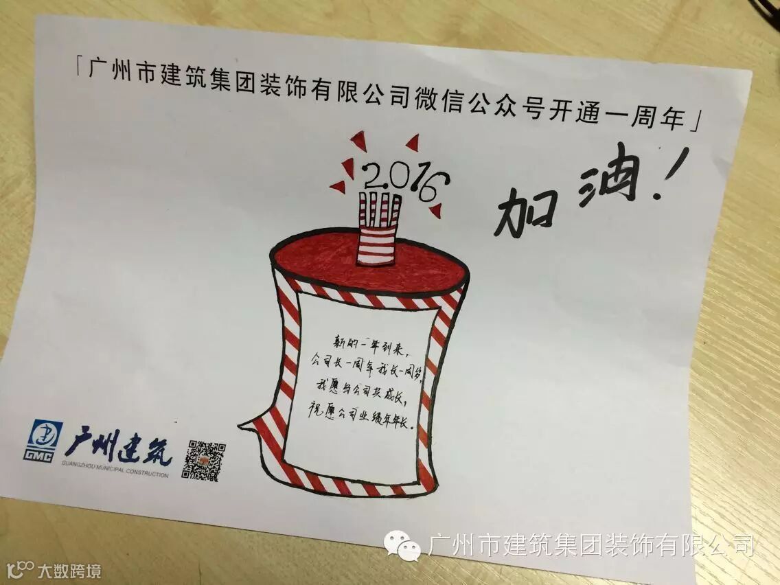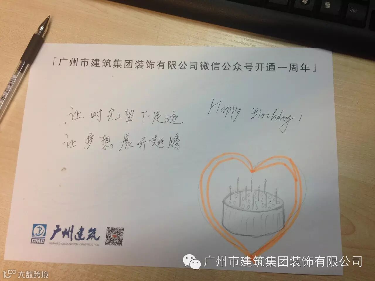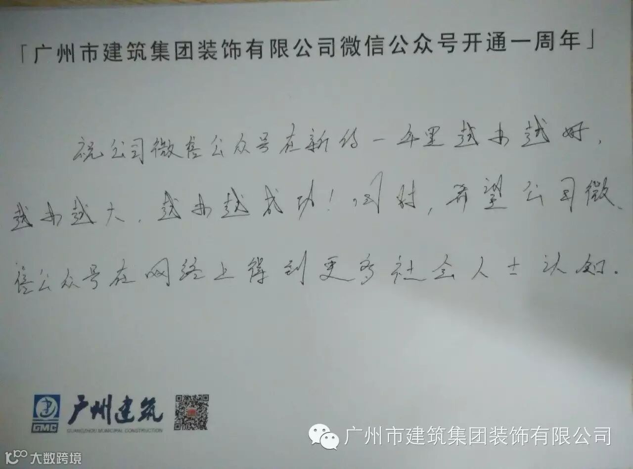 公司同事送祝福:“庆祝广州市建筑集团装饰有限公司微信公众号开通一周年!在过去的一年里,公众号发表的文章非常符合现代建筑装饰行业的发展状况及建议,具有很强的学习性,同时也辛苦为微信公众号为之付出的同事,在新的一年里祝微信公众号越办越好!”