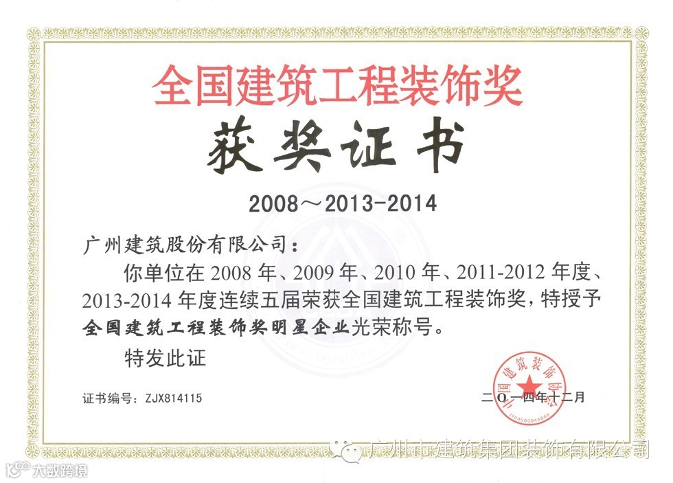连续五届荣获全国建筑工程装饰奖,被授予“全国建筑工程装饰奖明星企业”光荣称号。