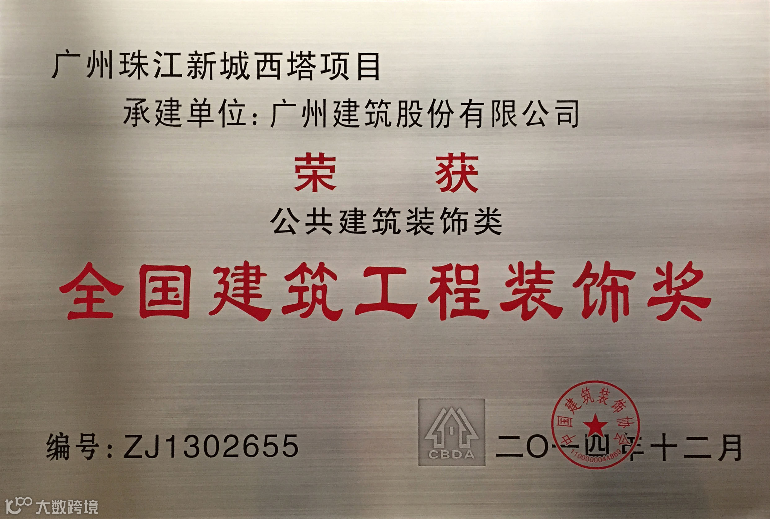 广州国际金融中心雅诗阁服务公寓(西塔项目)荣获“2013-2014年度全国建筑工程装饰奖”。