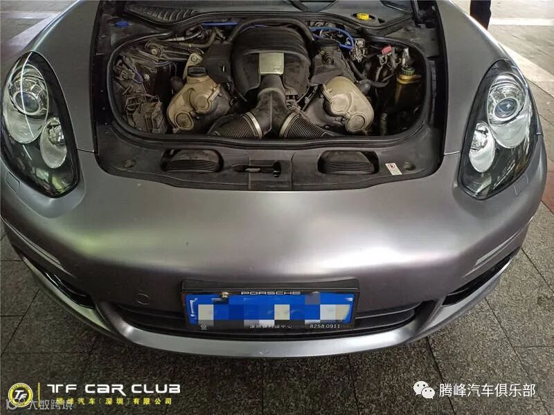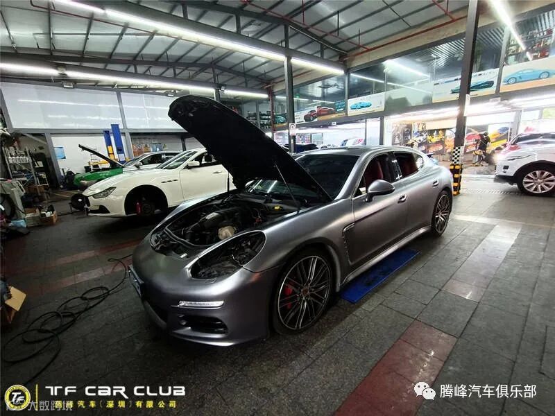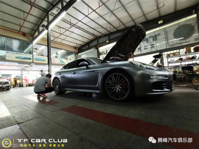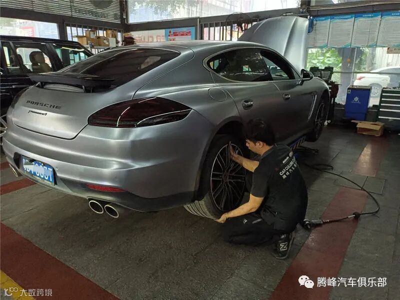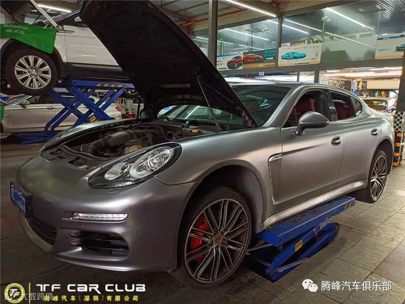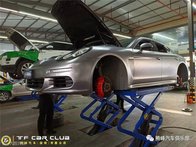 这是一台老款的保时捷帕拉梅拉Panamera,车主去年底刚贴了电光灰改色膜,最近车主反映刹车时有点抖动,前大灯也有些问题。来厂经过维修师傅检查确定之后,发现刹车盘磨损起槽,刹车盘变形,需要更换新的刹车盘或刹车光盘,前大灯故障也需要进行维修。