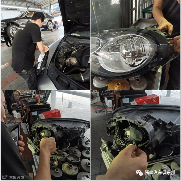 维修师傅需要先要把大灯拆下来,拆下来后发现保时捷的大灯曾经维修过,初步判断是线路故障。