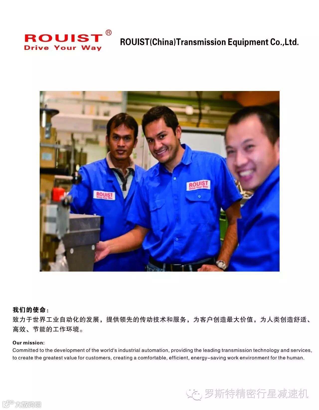 罗斯特传动设备(中国)有限公司是专业生产各种精密减速机的中外合作企业。公司与德国ROUIST-AUTO公司合作于2013年12月在深圳成立,聚焦于中国工业自动化领域,追求领先的精密技术,提供高、精、尖的精密减速器产品。通过继承和发展德国ROUIST-AUTO公司50多年积累的先进齿轮技术,研发的新一代精密行星减速器,具有精度高、扭转刚度高、可靠性高、噪音低、长寿命、免维护等特色。