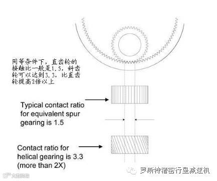 斜齿轮增加接触比,使行星减速机的性能得以提高。接触比是指在任意给定时间啮合的齿轮齿数。直齿轮的典型接触比为1.5,而斜齿轮的接触比可增加一倍至3.3。通过斜齿轮增加接触比可获得: