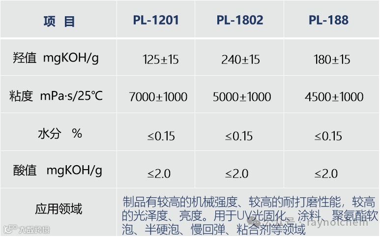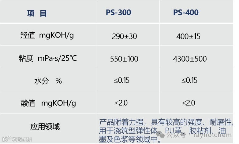 产品附着力强,具有较高的强度、耐磨性。用于浇注型弹性体、PU革、胶黏剂、油墨及色浆领域中。