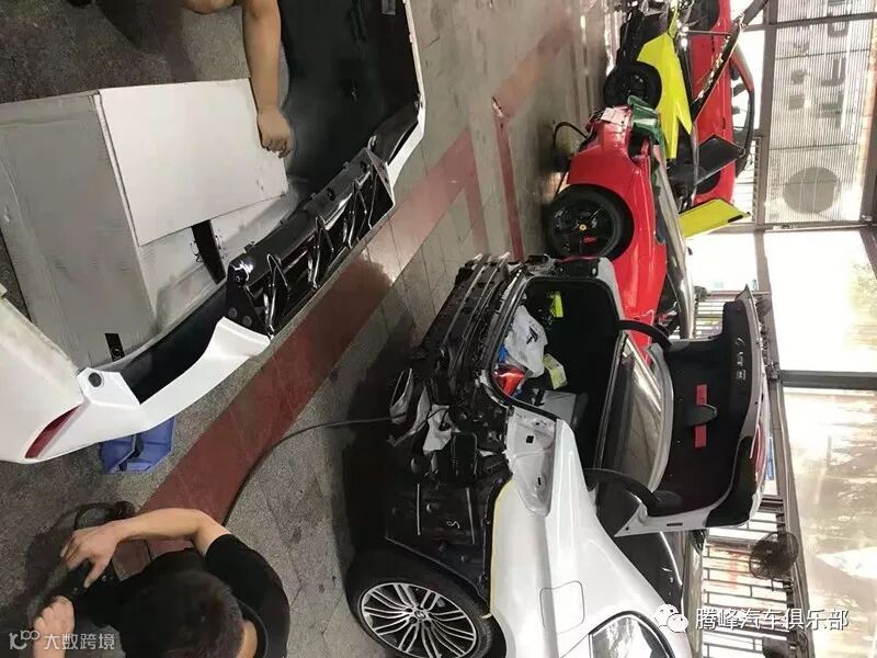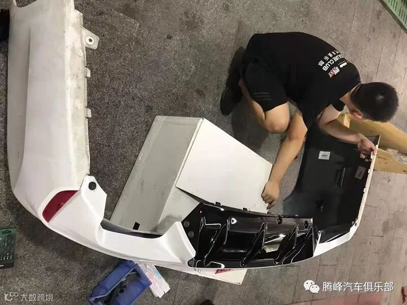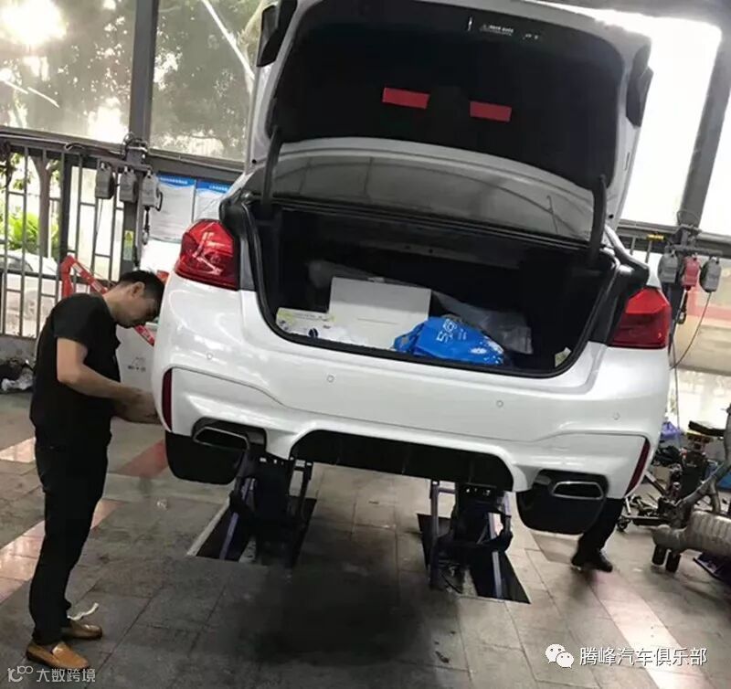 腾峰汽车俱乐部的改装师傅正在为宝马新5系加装钢琴烤漆亮黑后扰流板,安装过程,原车尾部下方预留孔位,只需要扭入螺丝固定即可,以确保工艺的美观,时尚,就要这样!