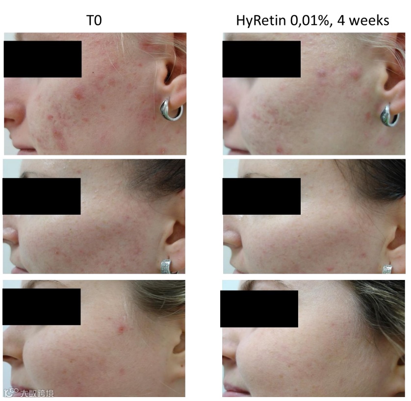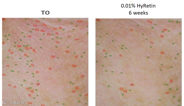 还有实验数据证明使用0.01% HyRetin六周后皮脂含量减少36%,毛孔尺寸减小25%,皮肤红斑减少6%。